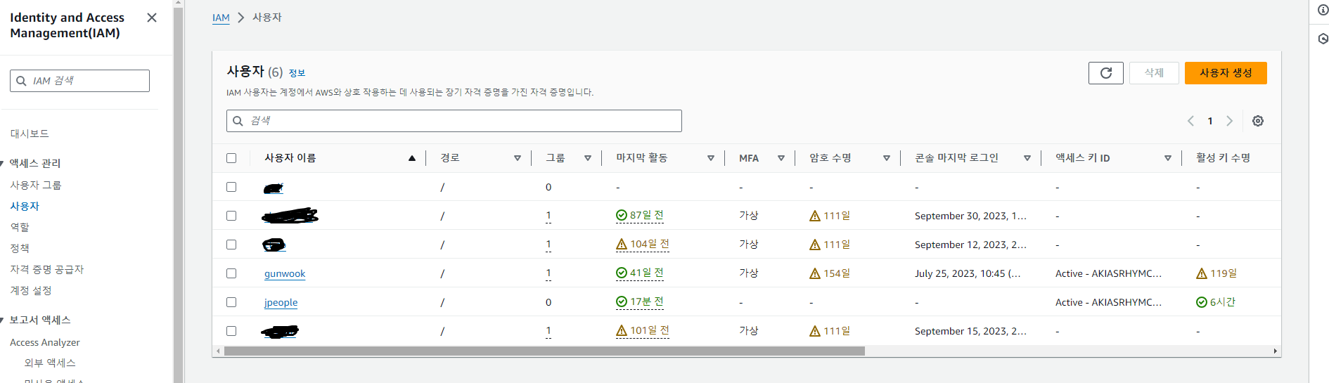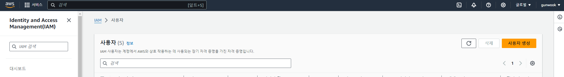 IAM을 검색해서 들어간후 [사용자 생성] 버튼을 누른다.