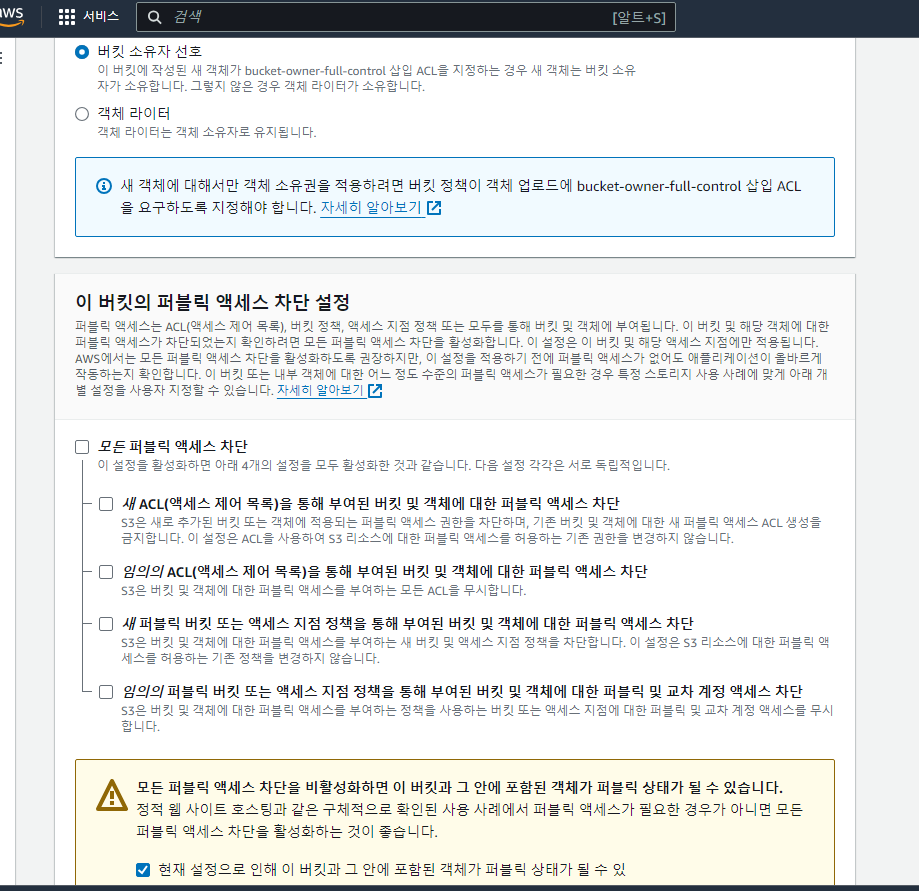 AWS 사이트에 들어가 로그인을 해준 후 S3탭에 들어가서 [버킷 만들기] 버튼을 누른다. 설정은 위의 설정만 똑같이 해주고 다른 설정은 건들 필요 없이 [버킷 만들기] 버튼을 눌러준다.