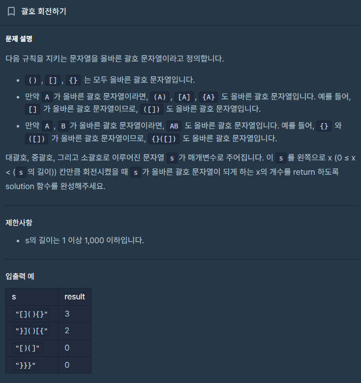 메서드 두 개를 작성했다. 첫 번째 메서드에서는 String 형식의 s를 char형으로 변환해서 list에 담아줬다. 그 뒤 forEach문을 사용해 list의 길이만큼 반복시켰고 내부에서는 Collections.rotate(list, -1)을 사용해서 리스트를 왼쪽으로 한 칸씩 이동시켰다. 그 뒤 isTrue(list)를 사용해서 list를 isTrue에 넘긴 뒤 그 값이 true라면 answer에 1을 증가하도록 했다.