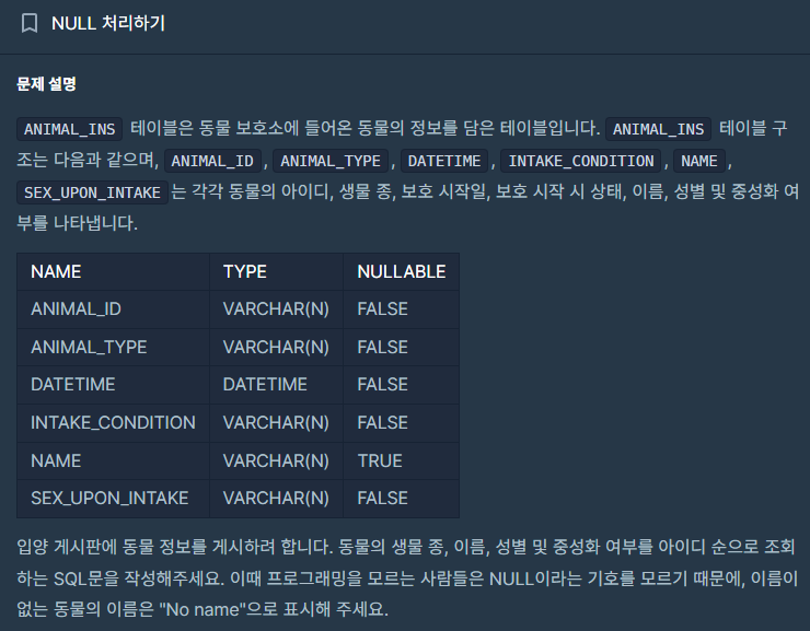 ANIMAL_INS 테이블에서 ANIMAL_TYPE을 가져오고 CASE문을 사용해서 NAME이 NULL값일때 No name을 넣어주고 아니라면 기존 NAME을 넣어준다. 별칭은 NAME으로 지어주고 SEX_UPON_INTAKE값도 가져와준다. 그 뒤 ANIMAL_ID를 기준으로 오름차순 정렬을 해줬다.