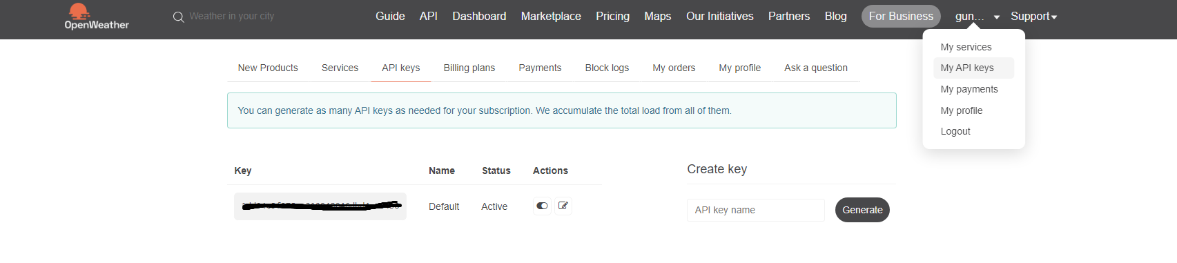 이제 [My API keys]를 눌러 API keys탭에 들어가 보면 key가 생성돼있다.
