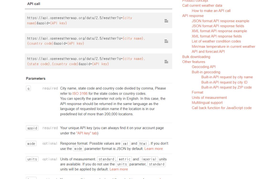 상단의 API를 눌러 스크롤을 내리다 보면 [Current Weather Data]가 보인다. [API doc]을 눌러서 api 호출 방식을 확인한다.