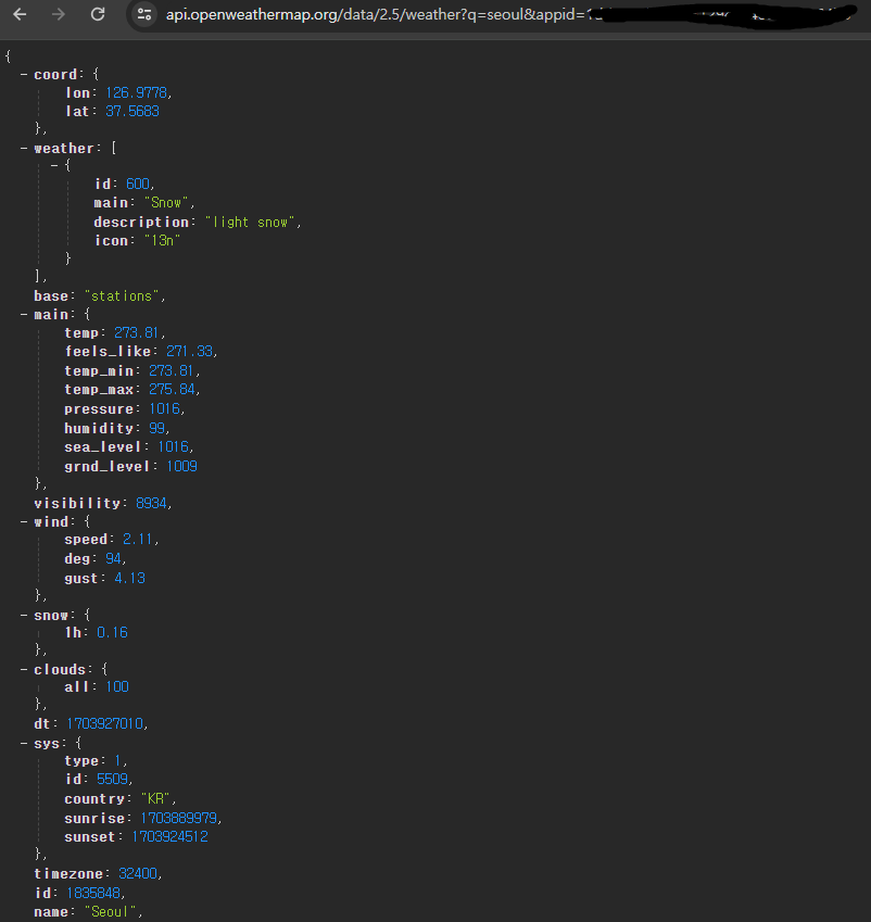 본인에게 맞는 api 주소를 찾아 값을 넣고 확인해 보면 된다. 나는 seoul로 테스트를 해봤다. 다음과 같이 JSON 형식으로 응답값이 온다. 이제 받아온 데이터를 가지고 본인의 사용용도에 맞게 가공해서 사용하면 된다.