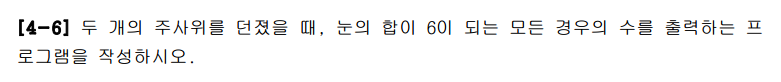 다음과 같이 코딩해 주면 된다. i, j는 1부터 6까지 반복될 것이고 중첩 for문에서 추가로 i+j가 6일 때만 출력되도록 코딩하였다.