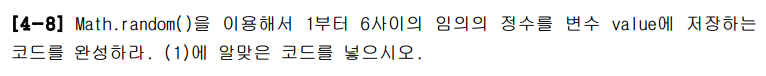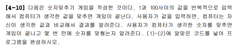 (1)에 들어갈 정답은 (int)(Math.random() * 100) + 1이다. 4-8문제에서도 설명한 내용인데 0~1 사이의 난수를 100을 곱해서 0~100 미만의 수를 갖도록 하고 +1을 해주어 1~100 사이의 임의값을 얻게 해 주었다.