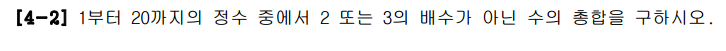 다음과 같이 i를 2로 나누거나 3으로 나눴을 때 둘 다 0이 아닐 때만 sum에 i값을 저장해 준다. i는 20까지 증가한다.