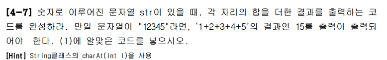 정답은 sum += str.charAt(i) - '0';이다. 다음 문장을 풀이하면 sum = sum + (str.charAt(i) - '0') 이 된다. sum안에 str.charAt(i) - '0' 의값을 계속 넣는 것이다. str.CharAt(i)를 통해 문자열의 각 자리에 접근한다. 그 후 '0'을 빼주어 해당 문자를 정수로 변환하여 sum에 넣는다. '0'을 빼주는 이유는 문자열을 숫자로 바꾸기 위해서이다. 유니코드를 활용하였다.