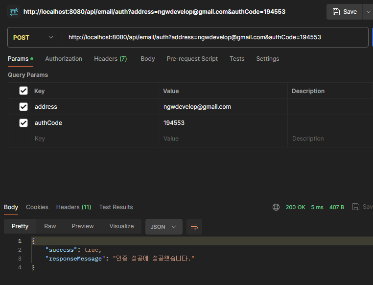 RequestParam방식으로 address에는 인증할 이메일, authCode에 인증번호를 넣고 POST 해본 결과 정상적으로 인증에 성공된 것을 확인할 수 있습니다.