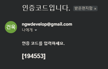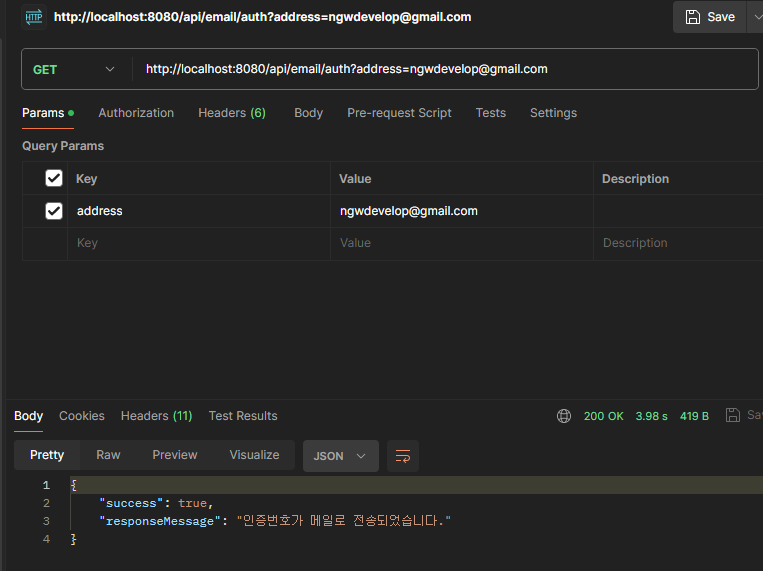 인증번호를 수신할 이메일을 address 값으로 지정해 준 뒤 GET 해주면 정상적으로 보내졌다는 true와 메시지, 200 코드가 반환됩니다.