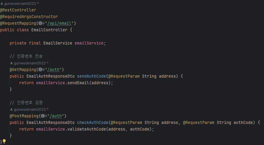 public EmailAuthResponseDto sendAuthCode(@RequestParam String address) {