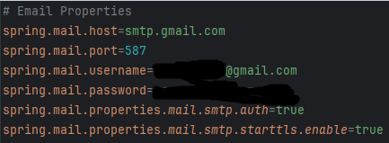 SMTP의 properties 작성법입니다. 아까 발급받은 본인의 지메일 주소와 저장해 둔 비밀번호를 입력해 주시면 됩니다.