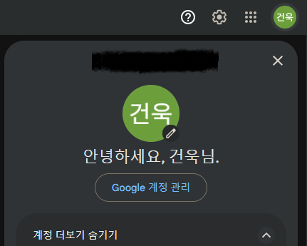 이제 우측 상단의 프로필버튼을 눌러서 <Google 계정 관리>를 클릭해 줍니다.