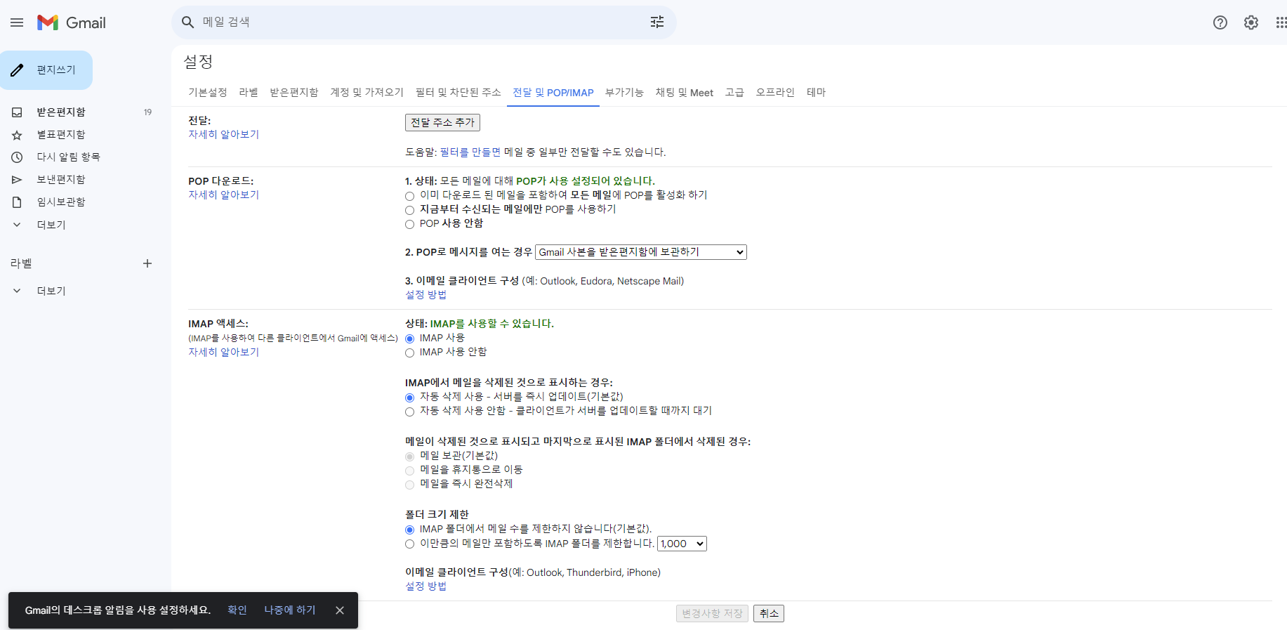 전달 및 POP/IMAP를 눌러주신 후 사진과 같이 체크한 뒤 <변경사항 저장> 버튼을 눌러 저장해 줍니다.