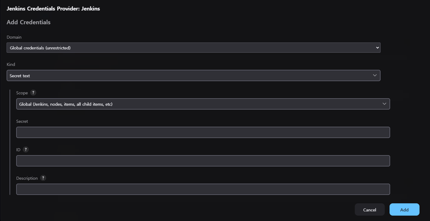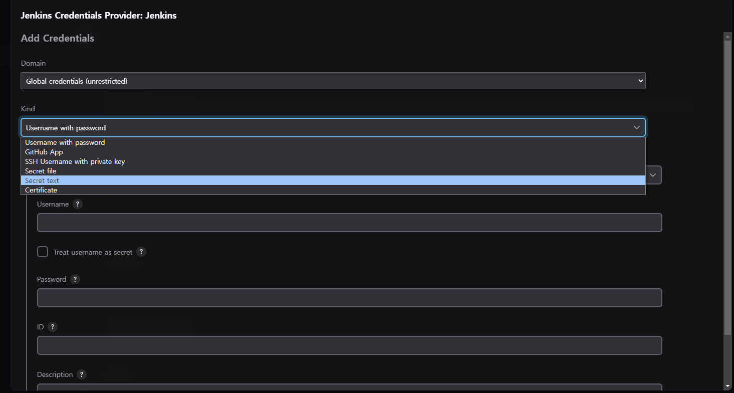 Secret text를 선택해 주고 토큰을 만들어 값을 입력해 줬다.