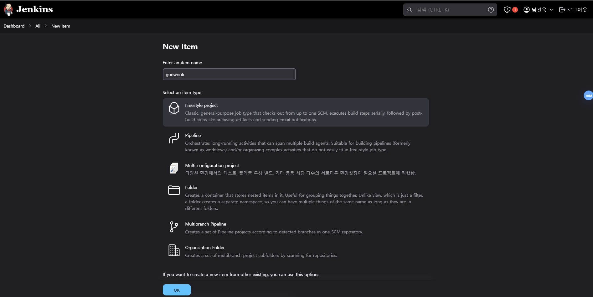 이름을 설정해 주고 Freestyle project를 선택한 뒤 제일 하단의 OK를 눌러준다.
