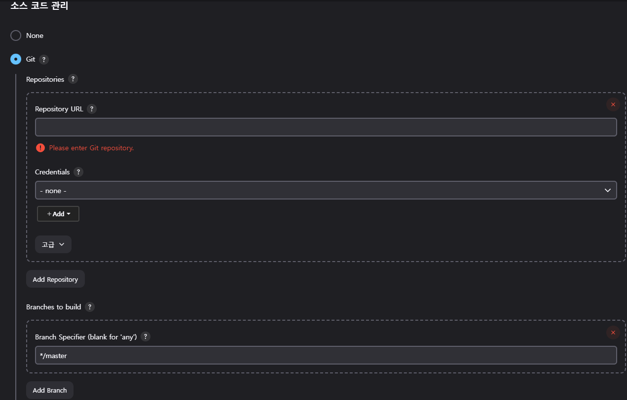Branches to build에는 Push가 일어났을 때 빌드할 브랜치명을 입력해 준다.