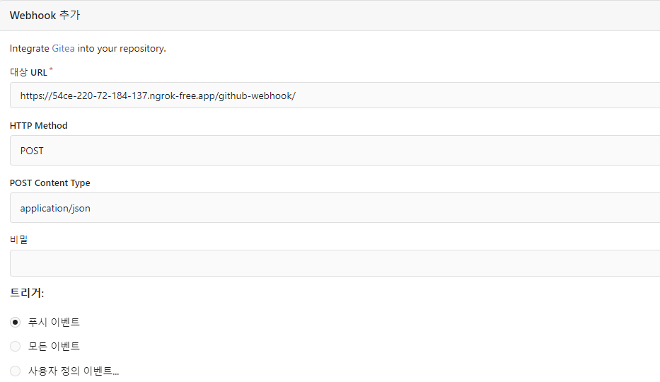 추가하기 버튼을 누른 뒤 본인의 ngrok 주소 + 뒤에 github-webhook을 추가해 준다. (git, github 사용자 모두 동일)