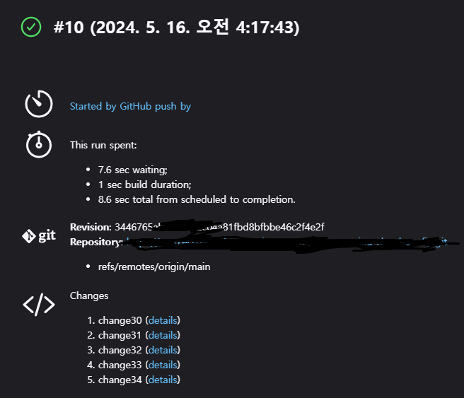 시작된 위치, 빌드 시간, git repository, branch 정보, 변경된 커밋등을 알 수 있다.