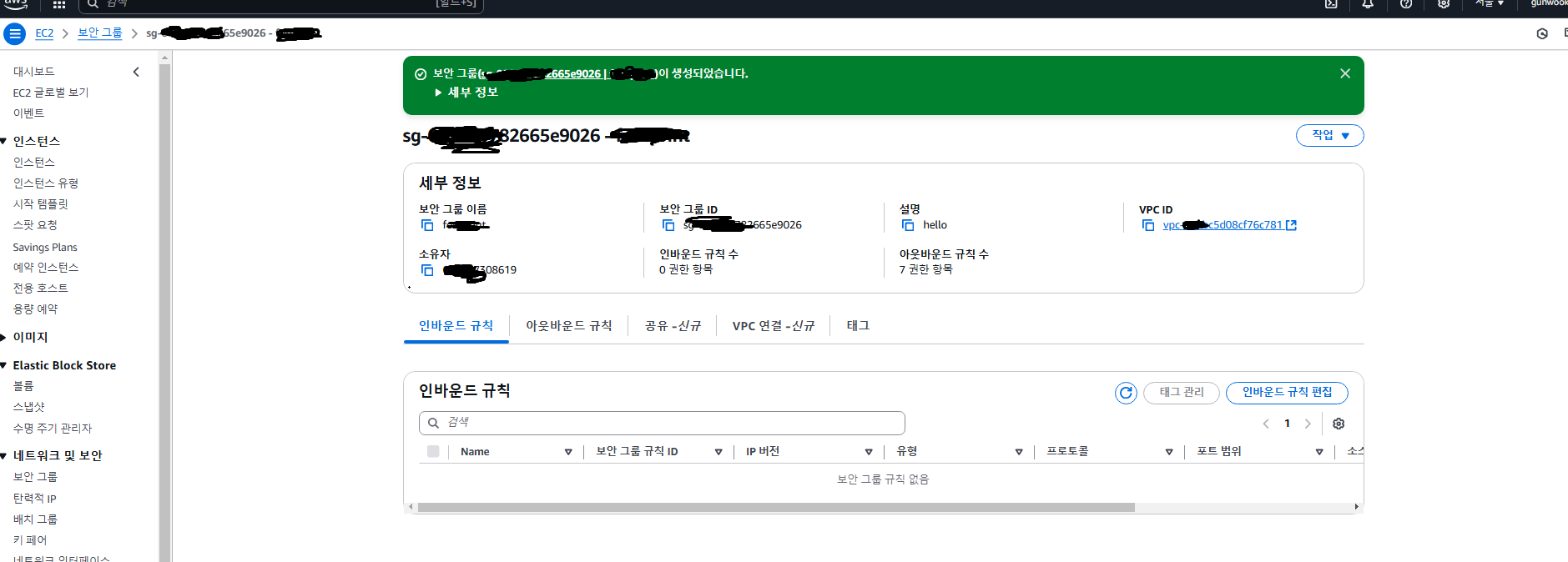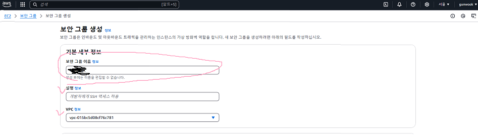 2. 보안 그룹 생성(키페어 생성 한 뒤 그 창은 그대로 두고 새로운 인터넷 창을 하나 더 켜서 잠깐 설정하기)
