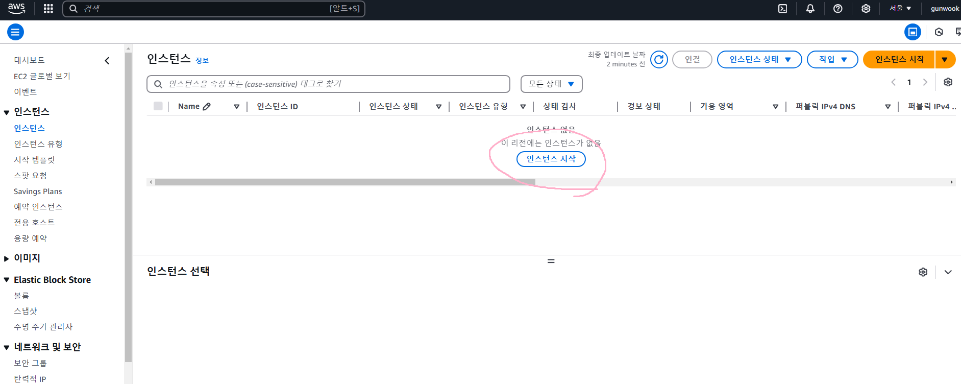 aws에 로그인 후 ec2에 들어왔다면 화면 중앙에 있는 인스턴스 시작을 눌러준다.