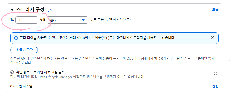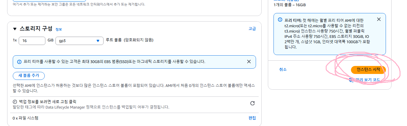 스토리지 구성은 기본 8기가로 되어있을 것이다. 난 16기가로 설정했다. 난 RDS를 사용하지 않고 DB까지 ec2에 올리려고 한다. 그래서 8기가로 쓰기엔 살짝 부족할 것 같아서 16기가로 했다. 최대 30기가까지 허용된다고 한다. 하지만 제한을 크게 해 두면 프리티어 용량이 금방 찰 것이다. 만약 서버만 띄울 예정이라면 8기가로 설정하고 넘어가도 충분할 것이다.