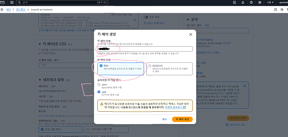 이제 키페어 이름을 지정해 주고 유형은 RSA로 지정해 준다. 프라이빗 키 파일 형식은 본인이 편한 대로 사용하면 된다. pem도 널리 쓰이지만 나는 putty가 편하기 때문에. ppk로 사용하려고 체크했다. 이 부분도 장단점을 찾아본 뒤 본인에게 맞는 유형을 선택하면 된다. 나는 둘 다 해봤지만 서로 큰 불편함을 못 느꼈기 때문에 이번에는. ppk를 선택했다. 설정한 뒤 키페어 생성을 눌러준다.