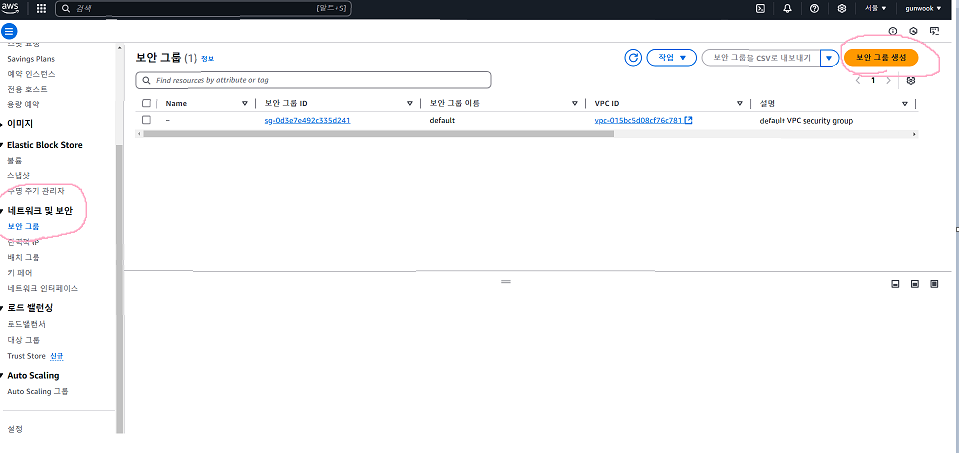 다시 ec2에 들어와서 네트워크 및 보안탭에서 보안 그룹을 클릭해 준다. 그 뒤 노란색과 주황색 사이인 보안그룹생성 버튼을 클릭해준다.