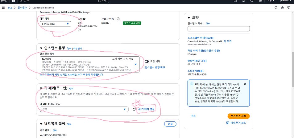 이제 첫 번째 동그라미인 아키텍처가 64비트로 되어있는지 확인 후 인스턴스 유형은 t2.micro로 선택해 준다. 어느 정도 자본이 된다면 다른 인스턴스를 선택해도 된다. 그 후 키페어를 만들어야 하니 별표가 쳐져있는 <새 키페어 생성>을 눌러준다.