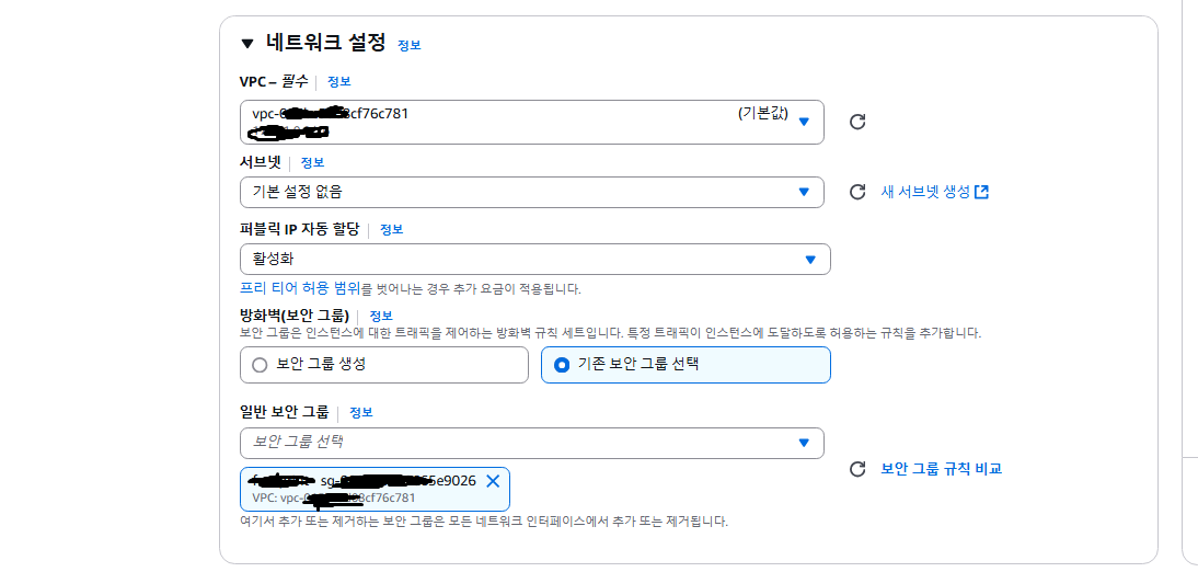 아까 키페어 설정까지 했으니 그 아래를 보면 사진처럼 네트워크 설정이 있다. 이때 방화벽탭에서 기본적으로 <보안 그룹 생성>으로 선택되어 있을 텐데 이것을 <기존 보안 그룹 선택>으로 변경한 뒤 방금 생성한 보안 그룹을 선택해 주자.