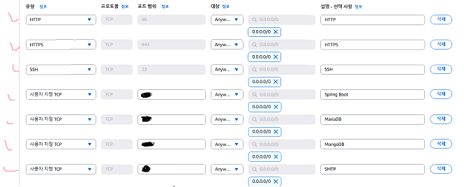 이제 인바운드, 아웃바운드를 지정해줘야 한다. 인바운드를지정해서 서버 외부와 통신할 포트를 열어준다. 나는 기본적으로 HTTP, HTTPS, SSH를 열어줬고, 서버와 화면 그리고 DB와 이메일 인증 때 사용할 포트까지 열어줬다. 현재는 대상탭과 그 오른쪽에 0.0.0.0/0을 보면 모든 접근을 허용해 뒀다. 나는 현재 아직 테스트로 서버를 올릴 거 기 때문에 지정해 뒀다. 만약 작게라도 보안에 신경 써야 한다면 접근할 수 있는 IP를 제안해둬야 한다. 접근제한은 매우 중요한 부분이다.