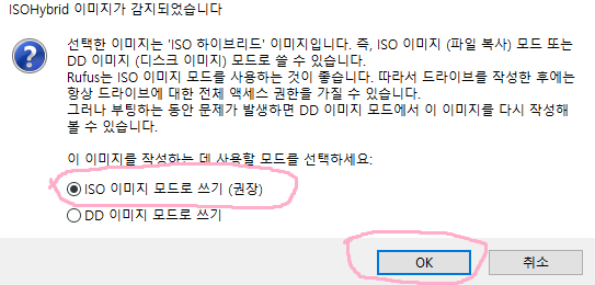 시작 버튼을 누르면 이화면이 뜬다. 권장하는 모드를 선택하고 OK 버튼을 눌러준다.