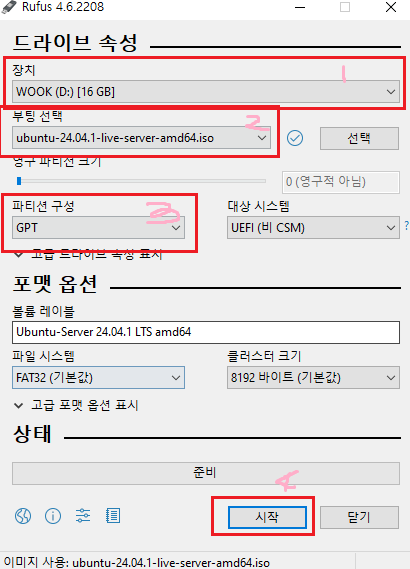 다운로드한 Rufus를 열어준 뒤 사진에 보이는 1번에 USB, 2번에 아까 다운로드한 ISO를 선택해 준다. 그 뒤 3번에는 GPT를 선택해 준다. 그 뒤 시작버튼을 눌러준다.