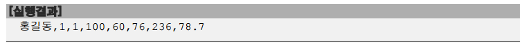 return name+","+ban+","+no+","+kor+","+eng+","+math+","+(kor+eng+math)