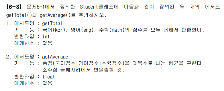 6-2 문제와 마찬가지로 Student 생성자 클래스를 정의해주었다. Student(){}을 해준이유는 기본 생성자를 만들어 놓지않으면 컴파일오류가 발생하기 때문에 추가해주었다. getTotal()메서드는 과목들의 합을 리턴해 주도록 만들었다. getAverage() 메서드는 과목의 평균을 리턴해주었다. info()메서드에서는 구현했던것들을 토대로 정보를 출력해주도록 하였다.
