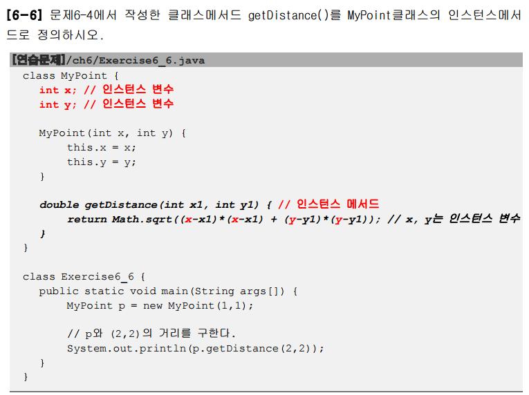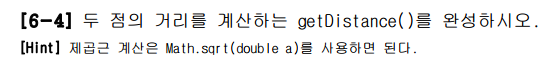 간단한 문제였다. 아까 6-4에서 작성한 메서드를 가지고와서 그대로 사용하였고 Mypoint를 정의하는 부분은 x, y만 생성해 주었다. 저 빨간위치에 생성된 변수는 인스턴스 변수이다.