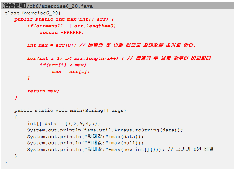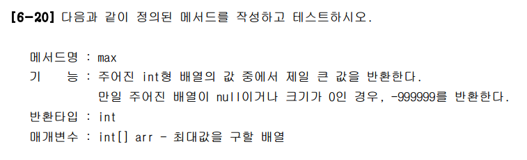 간단한 문제이다. 빨간색부분이 정답이다. 시작할때 arr가 null 이거나 넘겨받은 배열의 길이가 0이면 바로 -999999를 리턴해주었다. 그 후 배열의 첫번째값을 최대값으로 변경시킨후 최대값을 구해줬다. 최대값을 리턴해주면 끝이다.