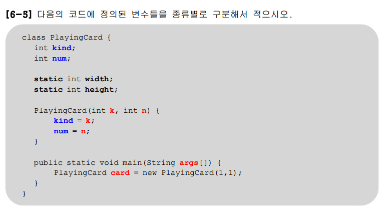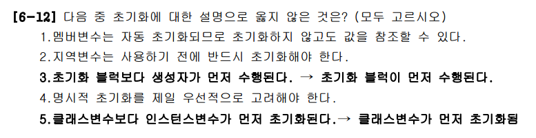 5번 클래스 변수가 먼저 초기화된다. 인스턴스 변수는 그 클래스의 인스턴스를 생성했을때 초기화된다.