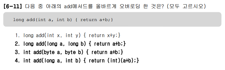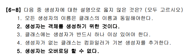 5번은 생성자도 오버로딩이 가능하다. CHAPTER 6의 내용에 있다. 매개변수를 달리하면 여러개의 생성자를 정의할 수 있다.