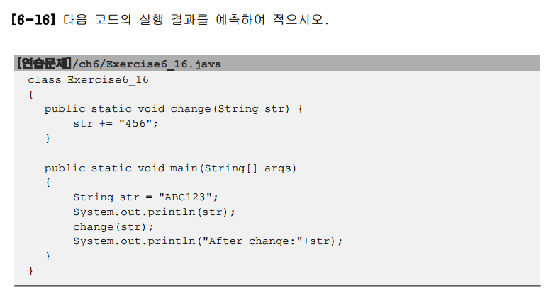 처음 ABC123은 그냥 그대로 출력하는것이고, 두번째는 왜 바뀌지 않았는지 생각할 수 있다. 처음에는 참조형이라서 문자열이 수정돼서 출력될것이라고 예상할 수 있다. 검색해보니 문자열의 불변성과 Java의 참조 동작에 의해 설명할 수 있따고 하였다. change(str)은 str+="456"한것을 새로운 문자열을 생성하고 그 새로운 문자열을 str에 할당 하는것이라고 설명하였다. 그러나 기존의 str변수는 변경되지 않는다. str변수는 main에서 선언한것과 별개의 변수가 된다.