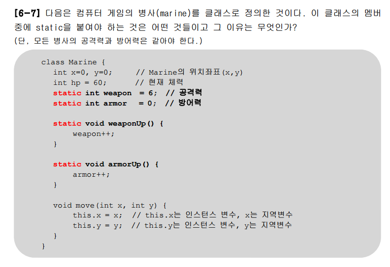 static을 어디에 붙여야하는지 찾고 설명을 하는것이었다. 일단 메서드 먼저 보았다. move(int x,int y)메서드는 인스턴스 변수에 매개변수로 받은 지역변수를 넣어주었기 때문에 static을 사용하지 않아도 된다고 생각했따다. 그리고 weaponUp() 메서드와 armorUp() 메서드는 공통적인 값을 가져야 하기 때문에 static을 붙여주었다. 그리고 이 메서드들이 사용하는 인스턴스 변수에도 static을 붙여주었다.