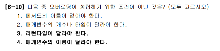 4번 매개변수의 이름이 달라야한다. 이것도 틀린말이다. 매개변수의 이름이 아닌 개수또는 타입이 달라야 한다.