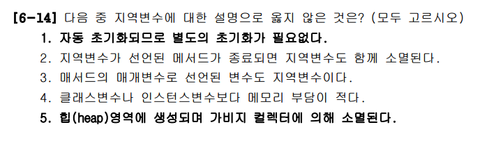 정답은 1, 5번이다. 지역변수는 자동으로 초기화 되지 않는다. 그래서 지역변수를 사용하기 전에 반드시 초기화를 해주어야 한다. 지역변수는 호출스택(call stack)에 생성된다. 힙(heap)영역은 인스턴스가 생성되는 영역이다.
