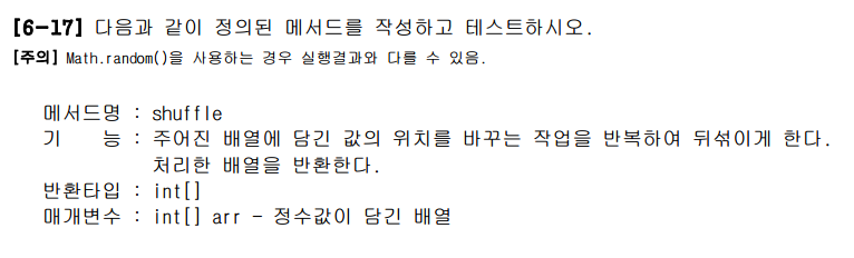 다음과 같이 코드를 작성 하였다. int[ ] arr를 매개변수로 받아왔다. 그 후 배열의 길이만큼 반복할것이고. int j에 배열의길이만큼의 랜덤한 숫자를 뽑아와서 섞어주었다. 그 후 어레이를 리턴해주면 끝이다.