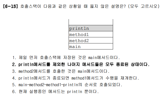 정답은 2번이다. 호출스택의 제일 위에 있는 메서드는 현재 수행중인 메서드이다. 호출스택 안의 나머지 메서드들이 대기상태인것이다. 현재는 println메서드가 현재 수행중인것으로 알 수 있다.