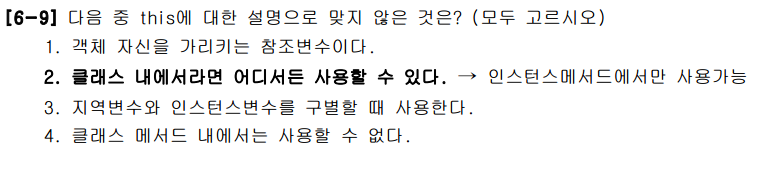 정답은 2번이다. this가 클래스 내의 어디서라도 사용이 가능하다고 나와있다. 하지만 static으로 선언된 클래스 맴버변수에는 사용할 수 없다. 인스턴스 메서드에서만 사용이 가능하다.