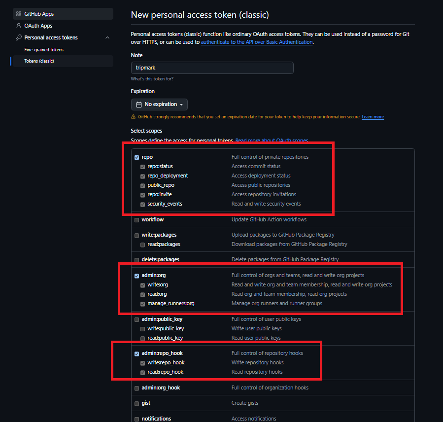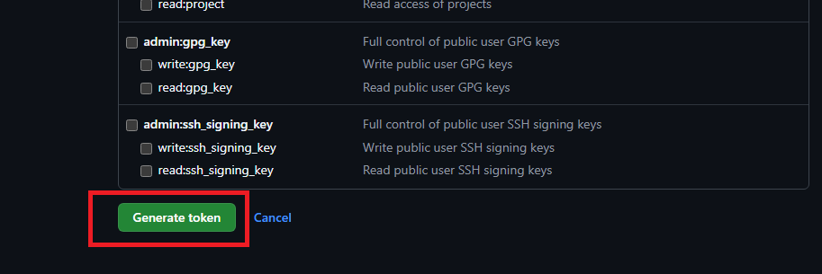 jenkins가 우리의 github repository에 접근할 수 있게 권한을 부여해 준다. 그 뒤 [Generate token] 버튼을 눌러주자.