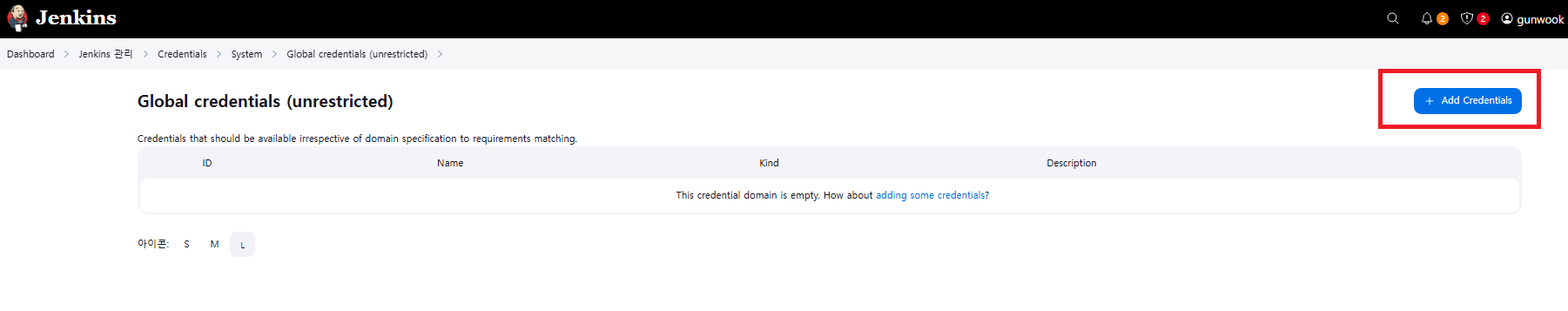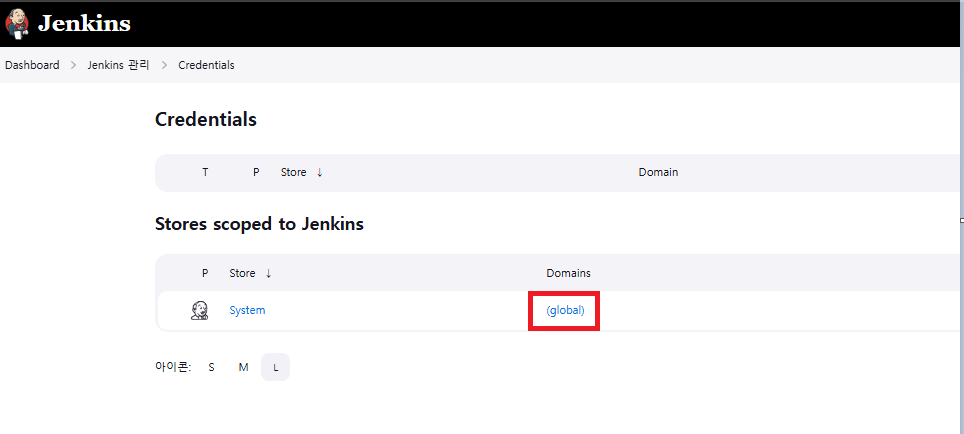 젠킨스에 들어와서 [jenkins 관리] 탭에서 [Credentials]를 클릭해 준다.