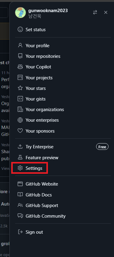 깃허브에 들어가서 내 프로필을 눌러주면 메뉴가 뜬다. 여기서 [Settings]을 클릭한다.