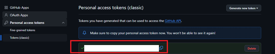 [Personal access tokens] 탭에서 [Token (classic)]를 눌러준 뒤 [Generate new token (classic)] 버튼을 눌러준다.