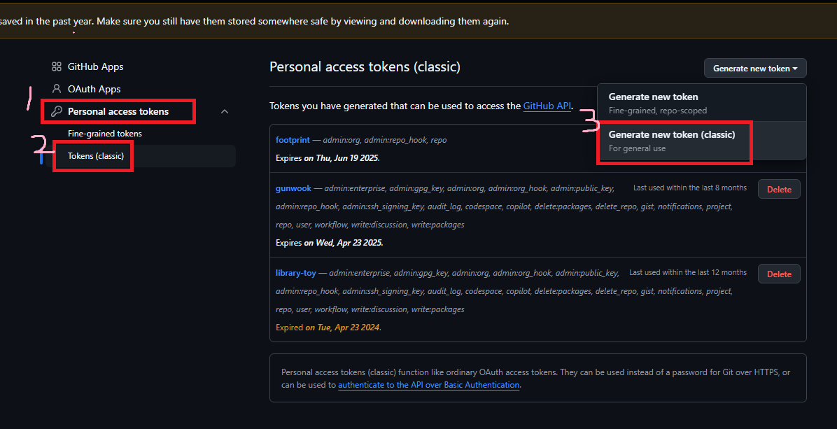[Personal access tokens] 탭에서 [Token (classic)]를 눌러준 뒤 [Generate new token (classic)] 버튼을 눌러준다.
